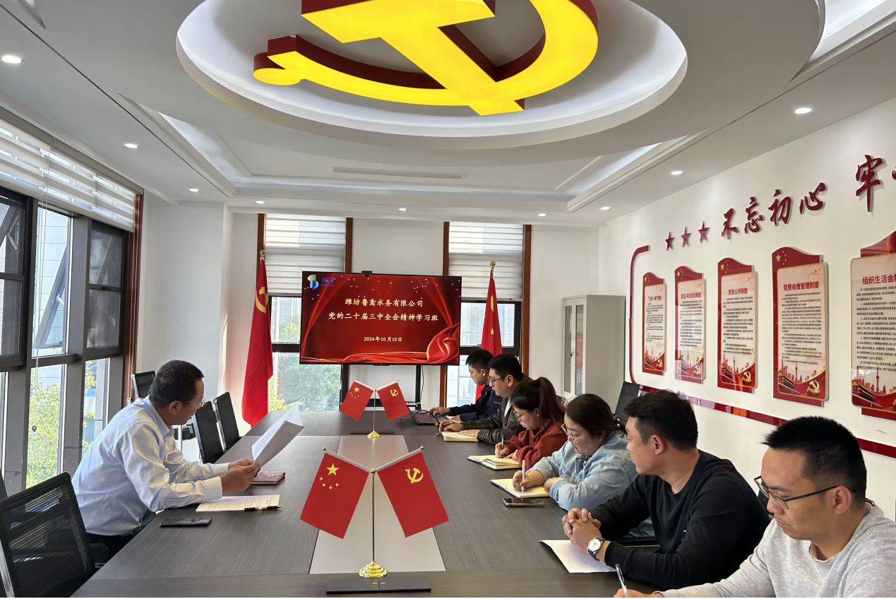 濰坊魯鳶水務有限公司黨支部組織多種形式學習傳達黨的二十屆三中全會精神,迅速掀起學習貫徹全會精神熱潮。通過集中領學、個人自學、交流研討等形式,全面認真學習了習近平總書記重要講話、中央《決定》及全會《公報》,并圍繞企業改革、企業高質量發展等主題開展深入研討交流。
