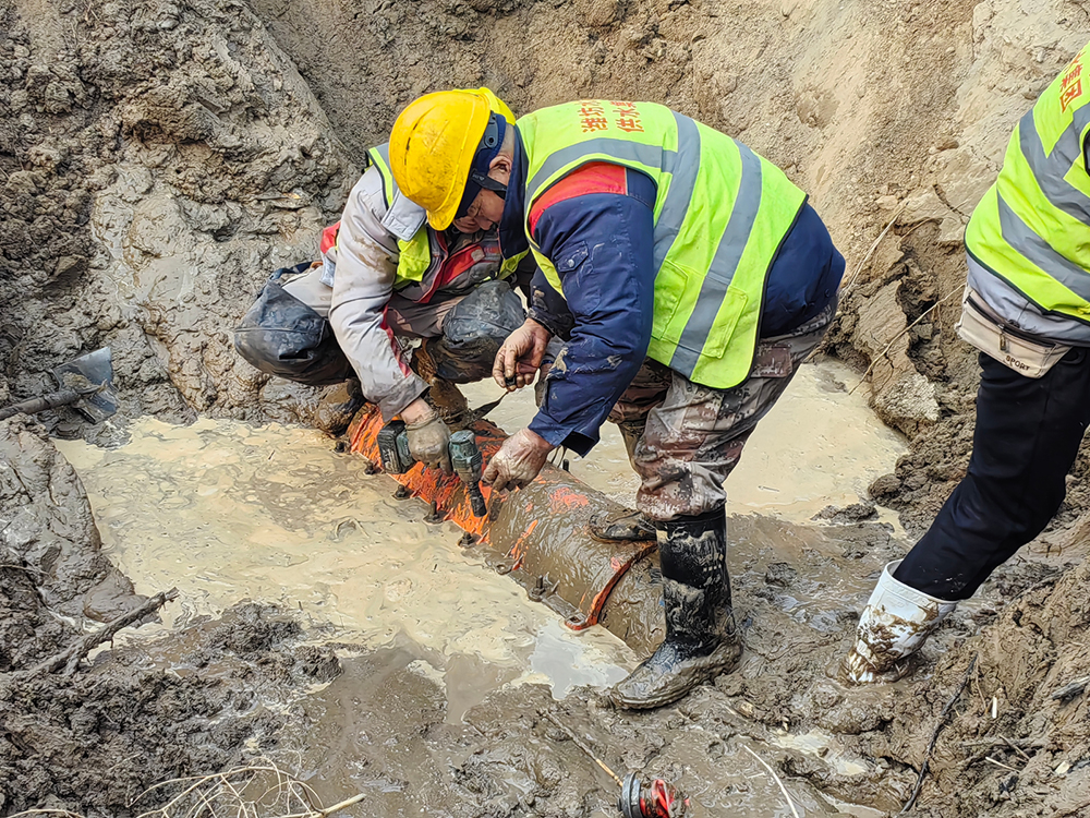搶修現場,因管線漏水導致路面塌方嚴重,確認漏點后,搶修人員緊急制定搶修方案,同時給下游客戶下停水通知。受現場施工條件所限,挖掘機清理完上層堅硬的砂石后,剩下的泥土只能用鐵锨一點點挖出。為縮短搶修時間,隊員們冒著零下8℃低溫天氣,全然不顧被泥水打濕的衣服和鞋子,站在冰冷刺骨的泥水里,徒手安裝螺栓。經過5小時的連續奮戰,最終比計劃時間提前4小時完成搶修,把因停水給居民帶來的影響降至最低,過往群眾紛紛為搶修隊員點贊。