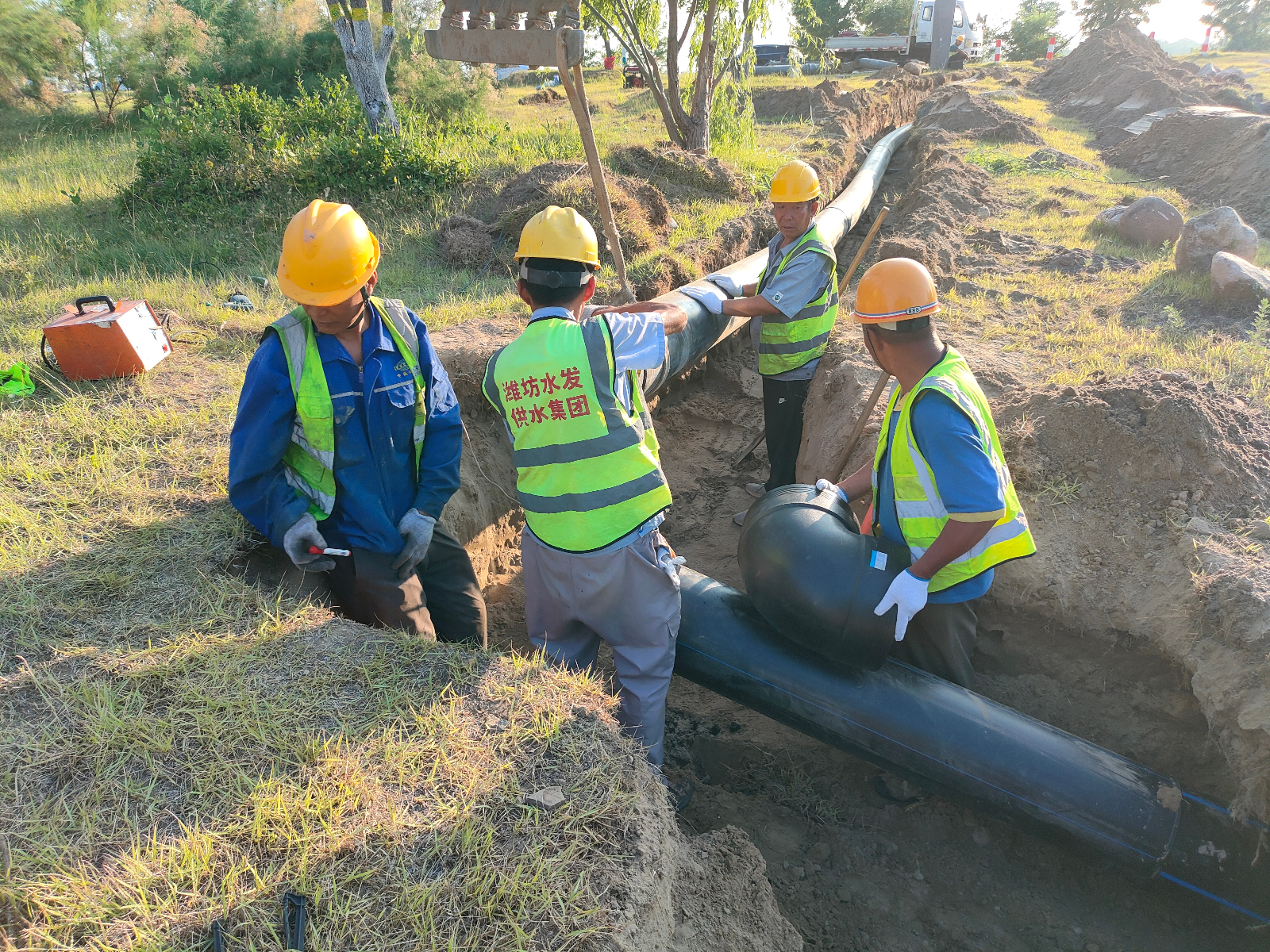 6月14日,了解到相關情況后,立即組織對大學城周邊區域的供水管網進行了全面檢查和評估。經過實地勘察和分析,由于近期持續高溫和降雨偏少,供水管線前端的單位、居民和綠化用水量驟增,導致處于末端的大學城水壓不足。要解燃眉之急,需新鋪設一條145米長,DN300PE供水管道,提升科創區供水壓力。通過對地形、地質、交通等因素的綜合考慮,確定最佳管道鋪設路線和施工方案后, 公司緊急調集施工隊伍和設備,迅速啟動了管道鋪設工程。